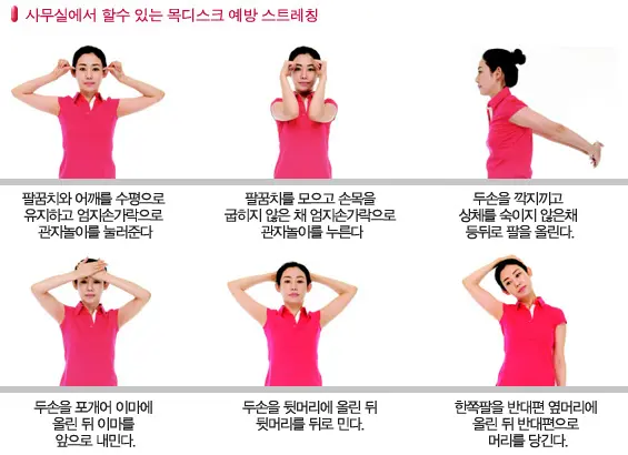 목디스크 예방을 위해서는 스트레칭과 운동이 필수적입니다. 간단한 목 스트레칭을 통해 목의 긴장을 풀어주고, 근육을 강화하는 운동을 통해 목을 지탱하는 힘을 기를 수 있습니다. 예를 들어, 목을 좌우로 기울이거나, 고개를 앞뒤로 움직이는 스트레칭을 통해 목의 유연성을 높일 수 있습니다. 아래의 사진을 참조해 주세요.