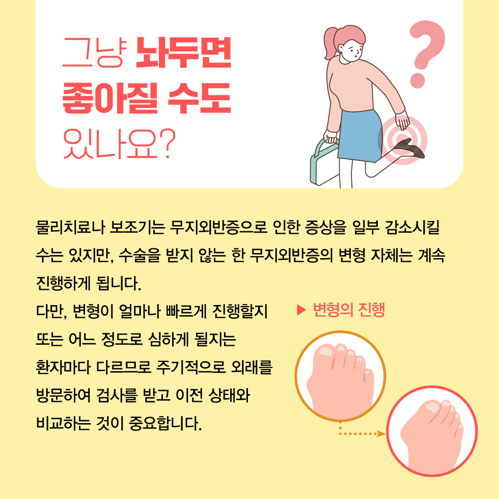 그리고 신발을 신었을 때 통증이 생기거나 일상생활에 불편함이 생긴다면 수술을 고려해야 한다고 합니다. 이미 뼈의 변형이 진행되었기에 호전될 순 없다고 하네요. 통증이 계속된다면 가까운 병원에서 진료받아 보시기 바랍니다.